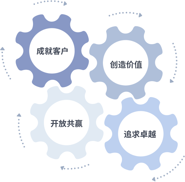 成就客户是一切决策的出发点,,,创造价值是衡量所有工作的标准,,追求卓越是我们做事做人的态度,,,,开放共赢是我们的格局也是最终的结果。。。。价值观的齿轮环环相扣,,,推动着组织里的每个人不断向前。。。。